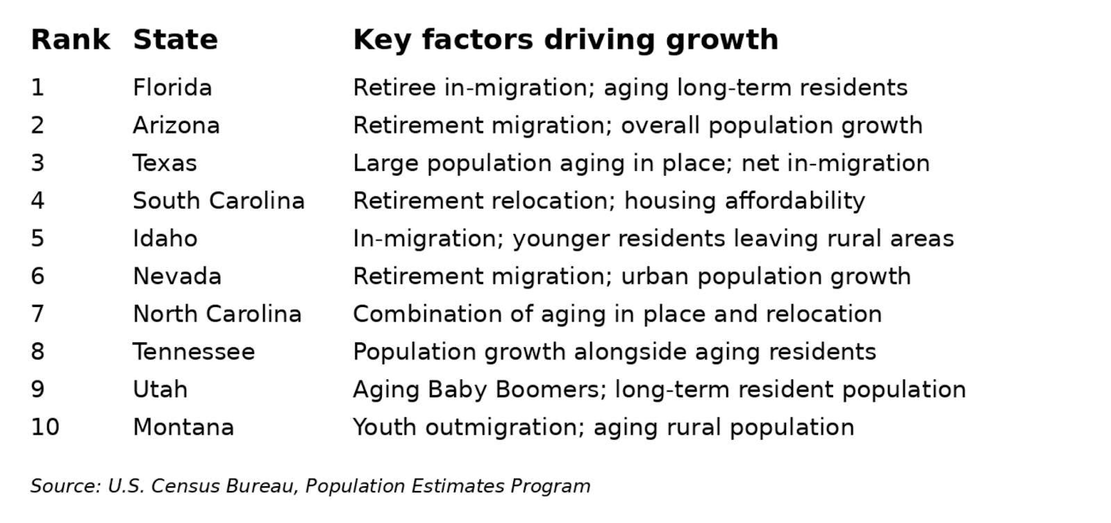 At the same time, migration tells only part of the story. In many states, growth in the older adult population is driven primarily by residents who have lived there for decades and are simply growing older. In places where younger residents are leaving for education or work, this effect can be even more pronounced, reshaping a state’s age profile without large numbers of new arrivals.